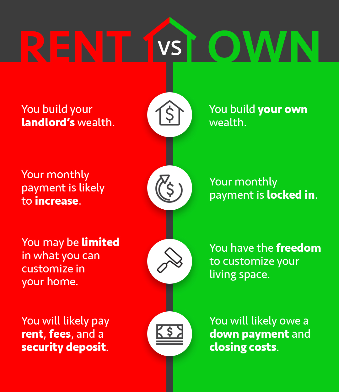 - Owning your own home vs. renting may lead to some great options, such as locking in your monthly payments and having the freedom to customize your living space.