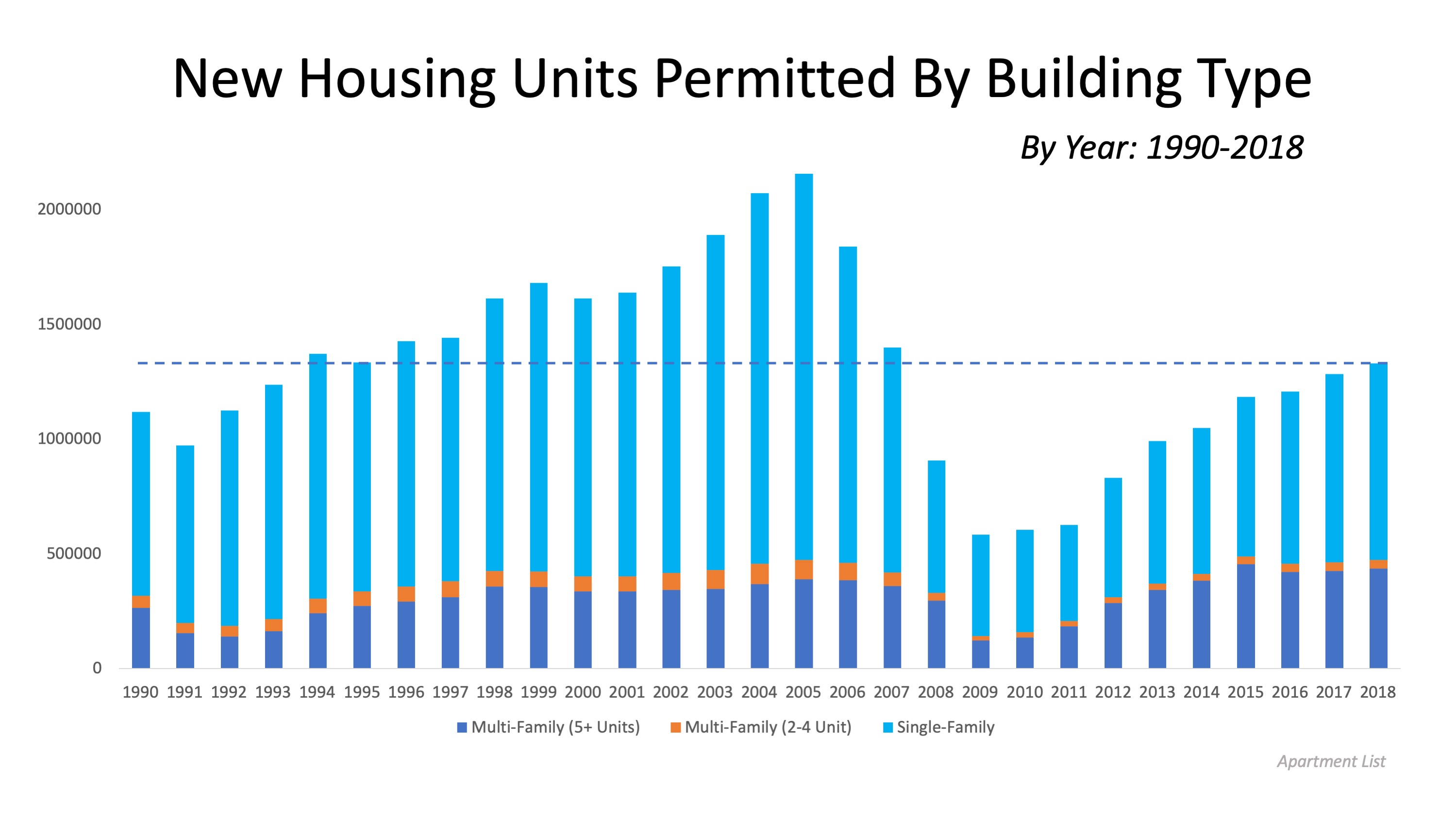 The number of new housing permits issued prior to the great recession increased for 15 years until 2005 (from 1.12 million in 1990 to a pre-recession peak of 2.16 million in 2005). According to Apartment List,