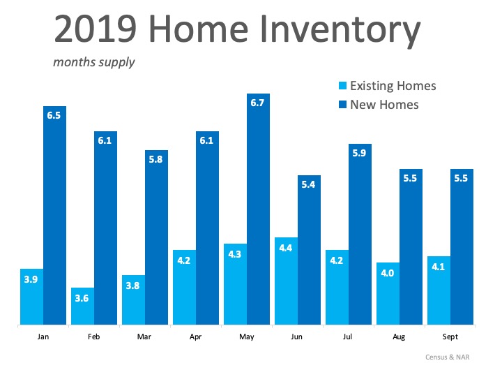 Inventory on the market today is low, especially among existing homes in the entry and middle-level tiers of the market. It is hovering well below the 6-month supply typically found in a more normal market, as shown in the graph below: