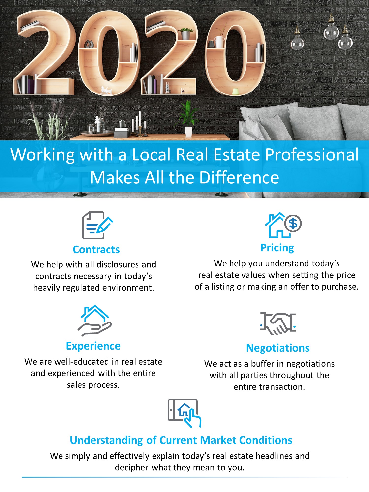 • If you’re considering buying or selling a home in 2020, make sure to work with someone who has the experience to answer all of your questions about pricing, contracts, and negotiations.