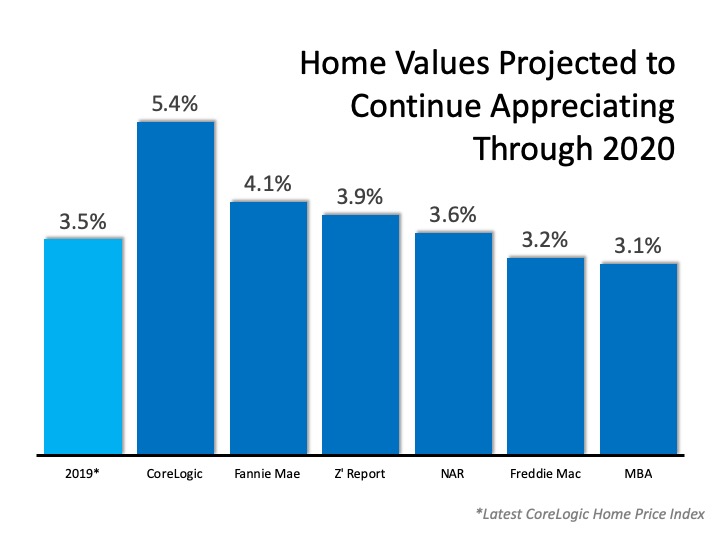 Below are the projections from six different expert entities that look closely at home values: CoreLogic, Fannie Mae, Ivy Zelman’s “Z Report”, the National Association of Realtors (NAR), Freddie Mac, and the Mortgage Bankers Association (MBA).The 2020 Real Estate Projections That May Surprise You | Simplifying The MarketEach group has home values continuing to improve through 2020, with four of them seeing price appreciation increasing at a greater pace than it did in 2019.