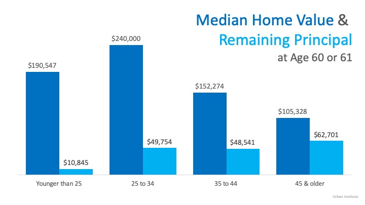 Based on this data, those who purchased their first homes when they were younger than 25 had an average of $10,000 left on their mortgage at age 60. The 50% of buyers who purchased in their mid-20s and early-30s had close to $50,000 left, but traditionally purchased more expensive homes.