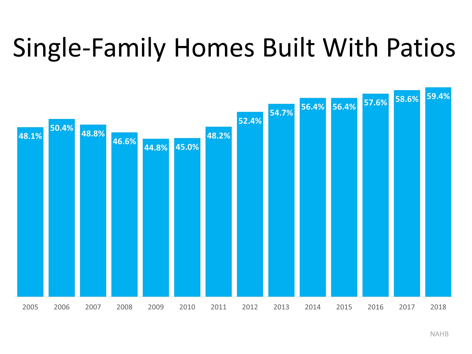 “Of the roughly 876,000 single-family homes started in 2018, 59.4% came with patios…This is the highest the number has been since NAHB began tracking the series in 2005.”