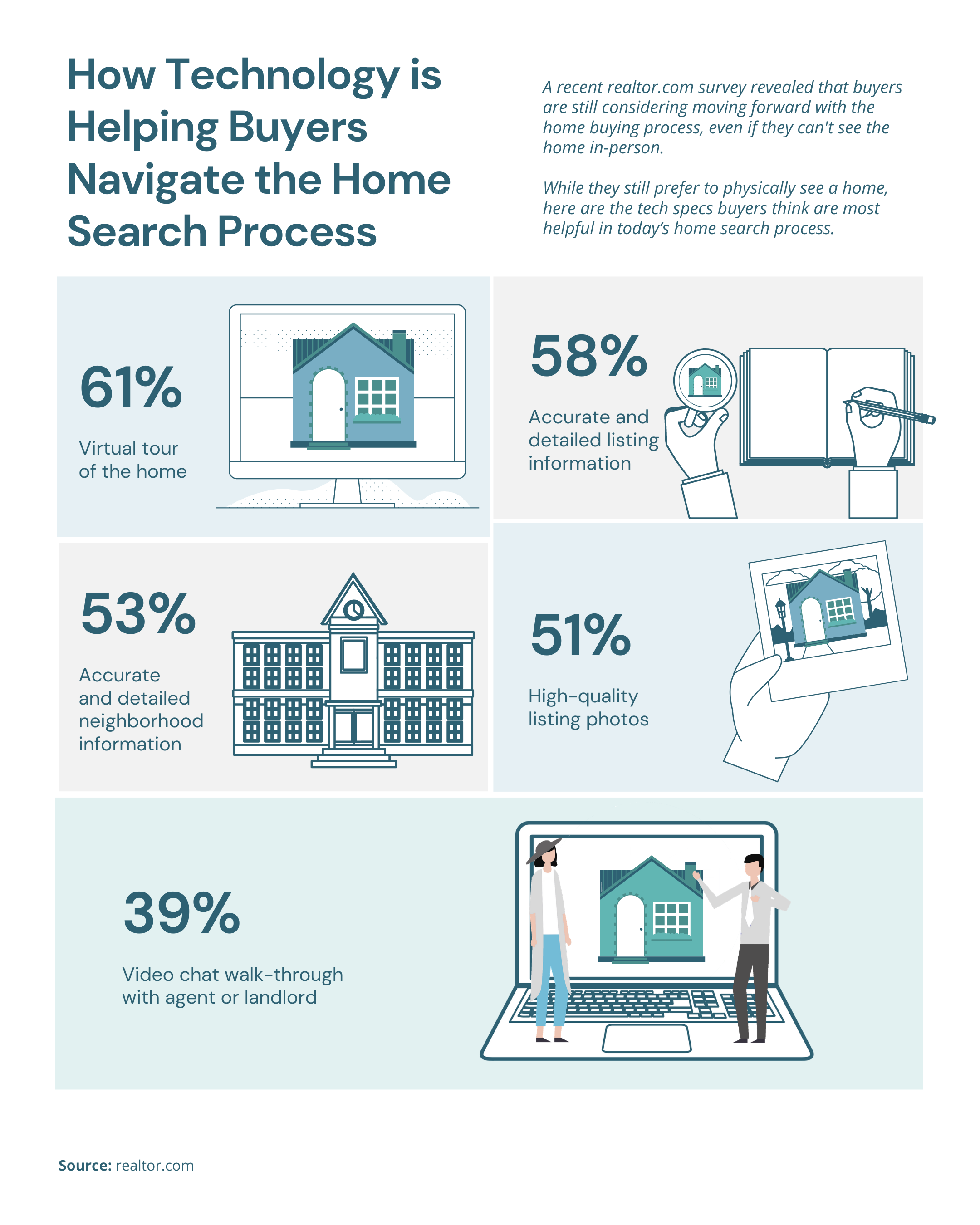 - While they still prefer to physically see a home, virtual home tours and accurate listing information top the list of tech specs buyers find most helpful in today’s process.