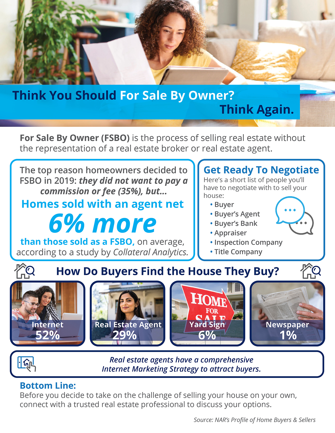 - According to the National Association of Realtors’ Profile of Home Buyers & Sellers, 35% of homeowners who decided to FSBO last year did so to avoid paying a commission or fee. But, homes sold with an agent net 6% more than those sold as a FSBO according to Collateral Analytics.