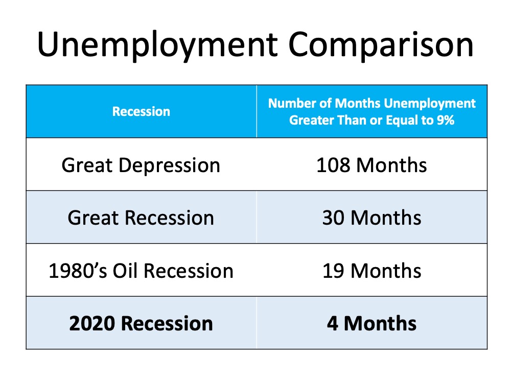 The following table shows how the current employment situation compares to other major disruptions in our economy:Is the Economic Recovery Beating All Projections? | Simplifying The Market