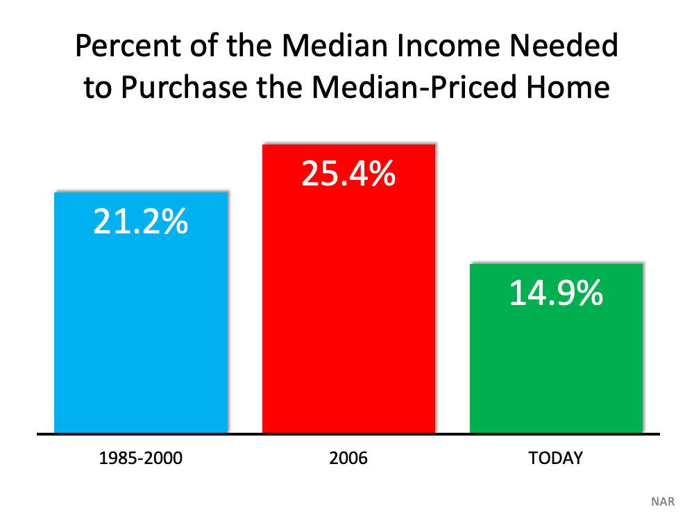 The affordability formula has three components: the price of the home, the wages earned by the purchaser, and the mortgage rate available at the time. Fifteen years ago, prices were high, wages were low, and mortgage rates were over 6%. Today, prices are still high. Wages, however, have increased, and the mortgage rate is about 3%. That means the average homeowner pays less of their monthly income toward their mortgage payment than they did back then. Here’s a chart showing that difference:6 Simple Graphs Proving This Is Nothing Like Last Time | Simplifying The MarketAs Mark Fleming, Chief Economist for First American, explains: