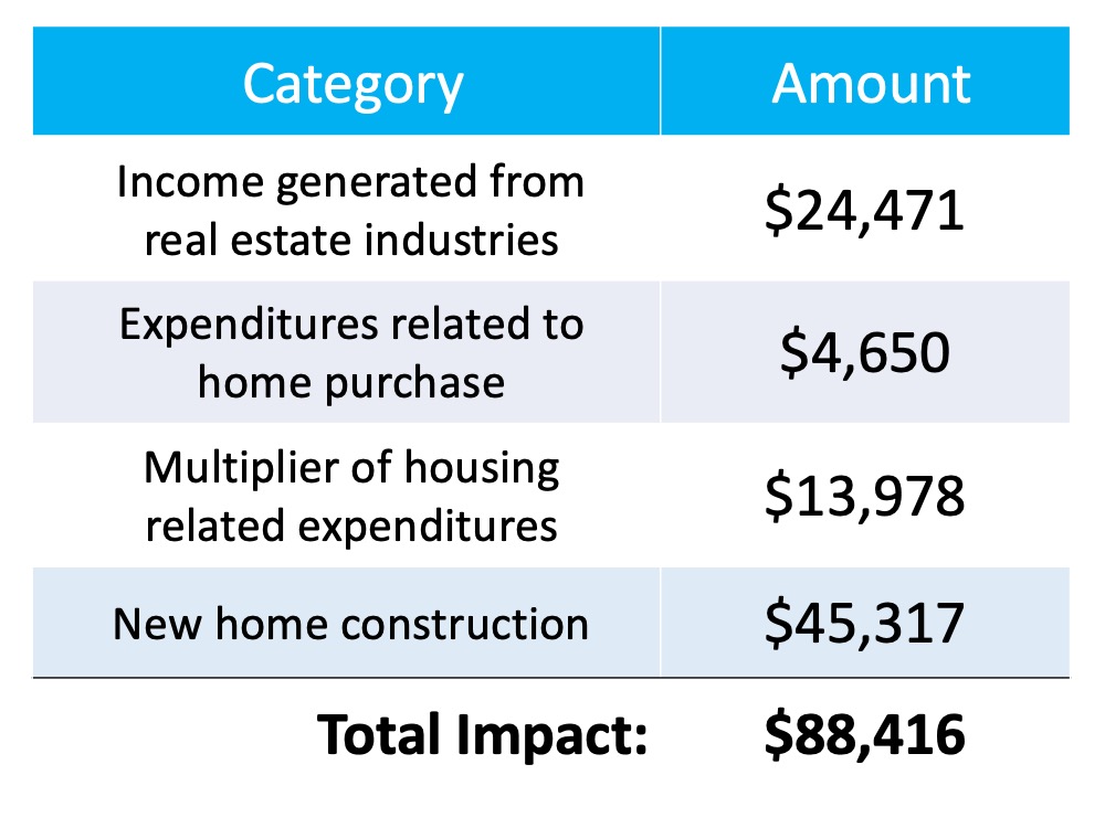 The report calculated the total economic impact of real estate-related industries on the economy as well as the expenditures that resulted from a single home sale. At a national level, their research revealed that a single newly constructed home had an economic impact of $88,416.