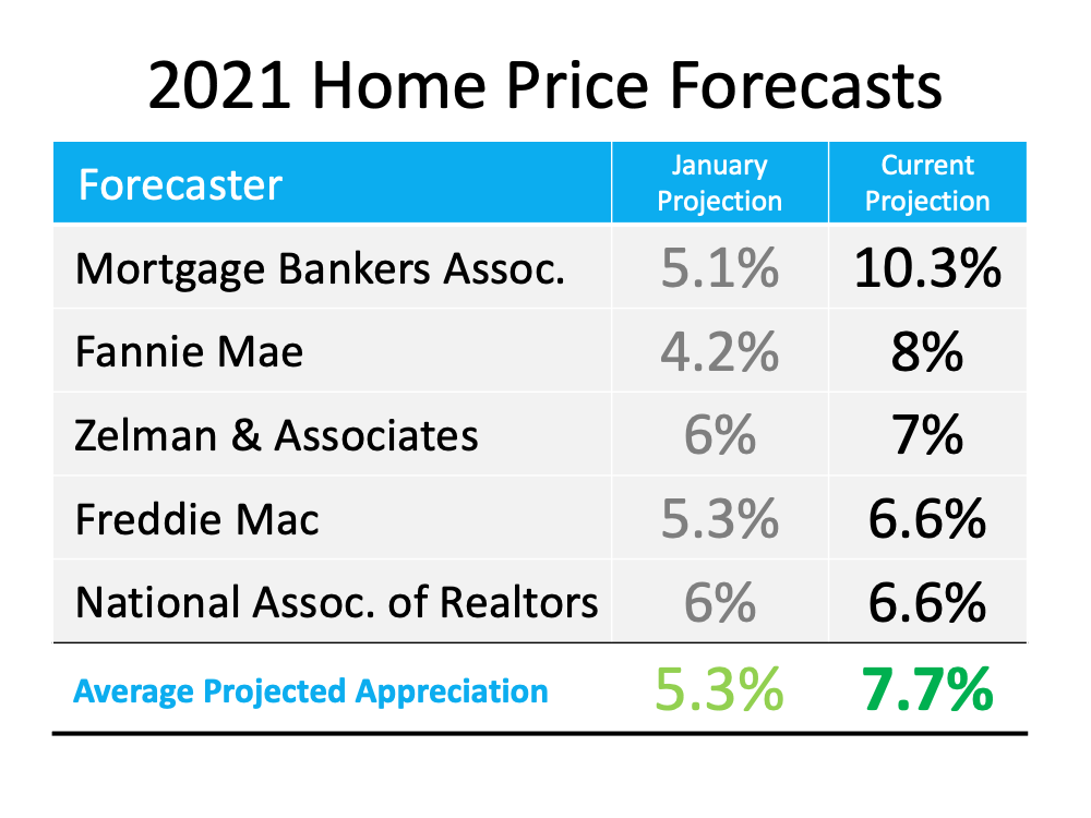 This has forced those who made appreciation forecasts this past January to amend those projections. The Mortgage Bankers Association, Fannie Mae, Freddie Mac, the National Association of Realtors, and Zelman & Associates have all adjusted their numbers upward after reviewing first quarter housing data. Here are their original forecasts and their newly updated projections: