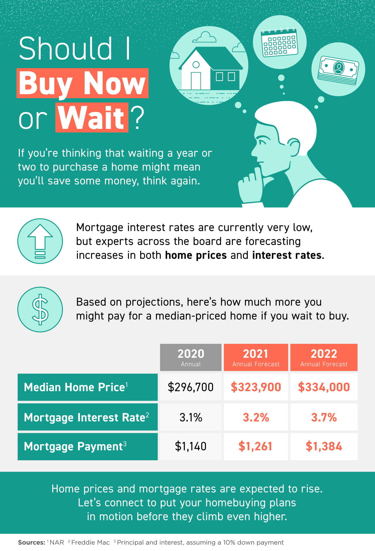 - Buying a home now means you’ll spend less in the long run. Let’s connect to put your homebuying plans in motion before home prices and mortgage rates climb even higher.