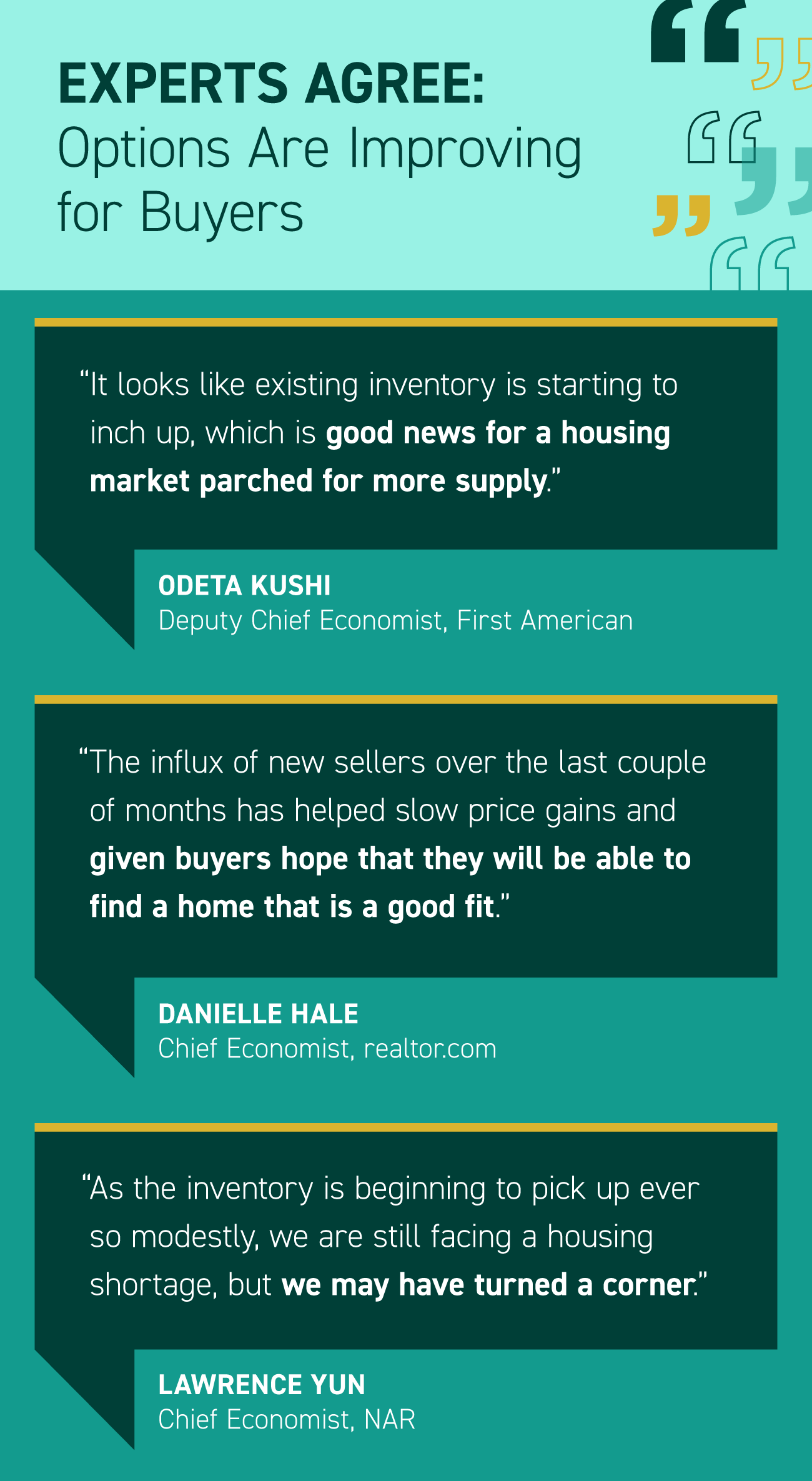 - Buyers hoping for more homes to choose from may be in luck as housing inventory begins to rise. Many experts agree – new sellers listing their homes is great news for buyers and the overall market.