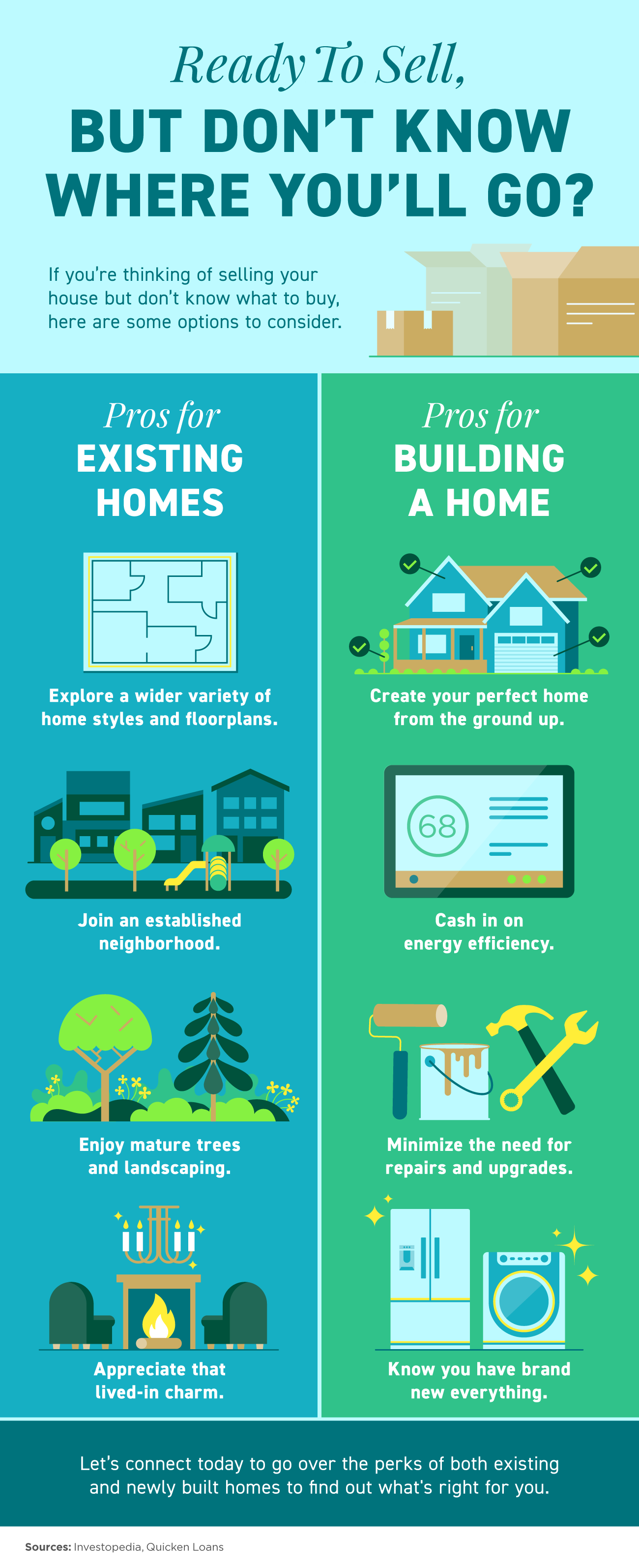 • Whether you’re looking for newly built or existing homes, both have their perks. If you’re ready to sell your house, let’s connect today to go over the perks of both existing and newly built homes to find out what’s right for you.