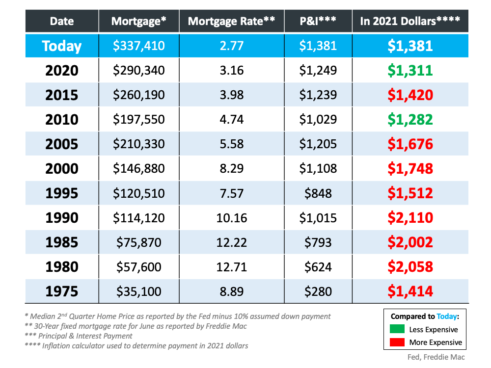 • In 2021 Dollars: Use an inflation calculator to determine what each payment would be when adjusted for inflation. Green means the homes were less expensive than today. Red means they were more expensive.