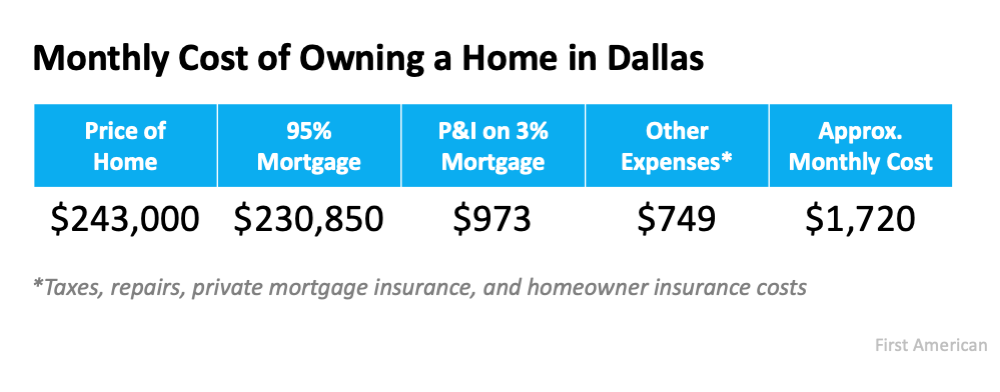 Let’s look at an example. In the above-mentioned post, Kushi examines the rent versus buy situation in Dallas, Texas. Kushi chose Dallas because home prices there sit near the median of the top 50 markets in the nation.
