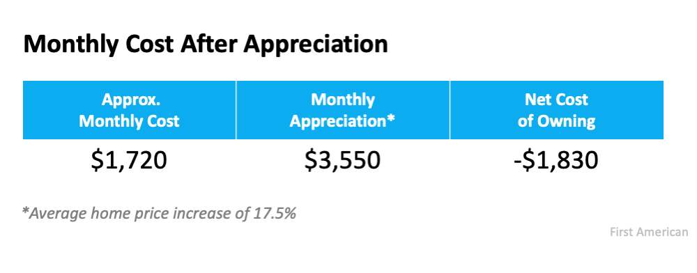 Kushi first calculates the monthly mortgage payment on a median-priced home with a 5% down payment and a mortgage rate of 3% (see chart below):If Housing Affordability Is About the Money, Don’t Forget This. | Simplifying The MarketKushi then takes the monthly cost and subtracts the appreciation the home had over the previous twelve months. The average house price in Dallas increased 17.5% in the second quarter of 2021 compared to last year (this is in line with the national pace). That equates to an equity benefit of approximately $3,550 each month if the pace remains the same (see chart below):If Housing Affordability Is About the Money, Don’t Forget This. | Simplifying The MarketWe can see the equity gained each month was greater than the monthly mortgage payment, resulting in a negative cost to own. The buyer could build their net worth by $1,830 each month – after paying their mortgage.