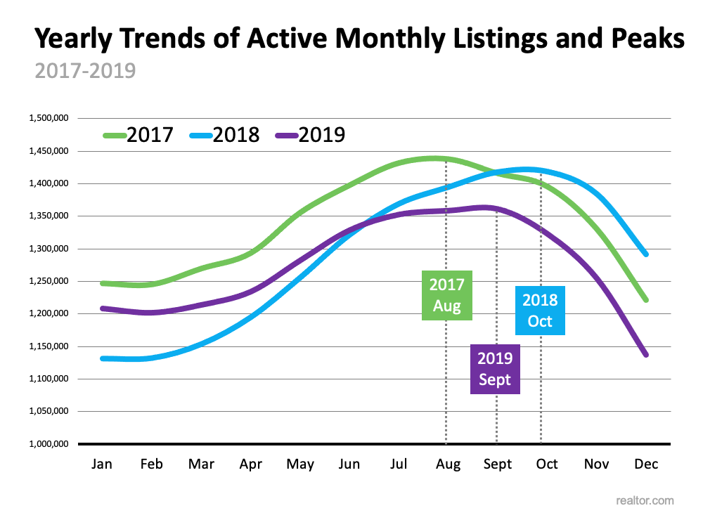 Historically, housing inventory increases throughout the summer months, starts to tail off in the fall, and then drops significantly over the winter. The graph below shows this trend along with the month active listings peaked in 2017, 2018, and 2019.Is the Number of Homes for Sale Finally Growing? | Simplifying The Market